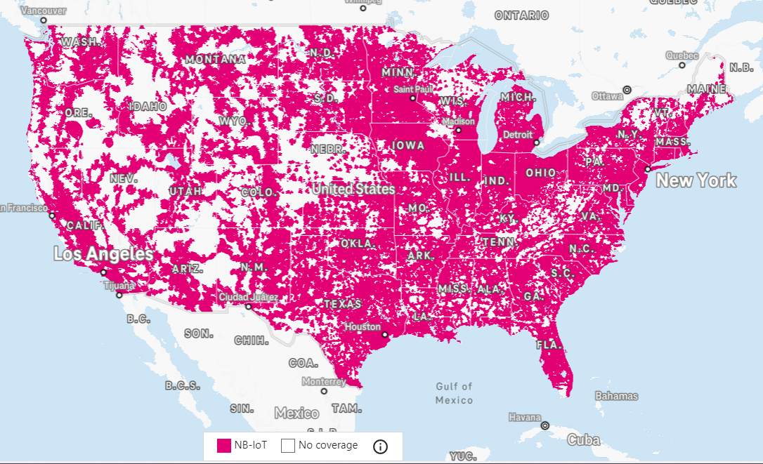 These maps demonstrate that, while these technologies may be available in your desired region, there are still dead zones of coverage that will exist while their deployment progresses. In the case of the T-Mobile NB-IoT map, this is a complete deployment that simply does not cover the entirety of the United States.
