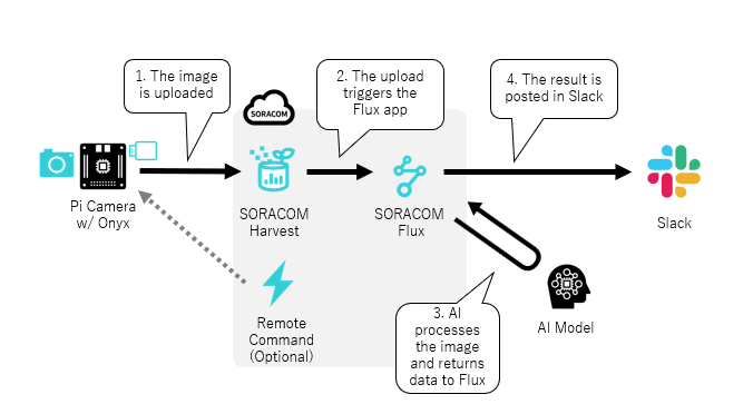 Soracom Remote Command can also be used to execute image upload, allowing for on-demand checks. This architecture reduces device requirements, centralizes monitoring, and makes it easy to add AI-driven insights into your operations.