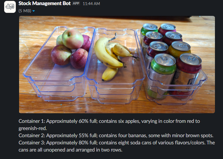 By capturing images of multiple containers, analyzing them with an AI model, and automatically sharing results in Slack, you can monitor stock levels remotely without needing a sensor on every bin.