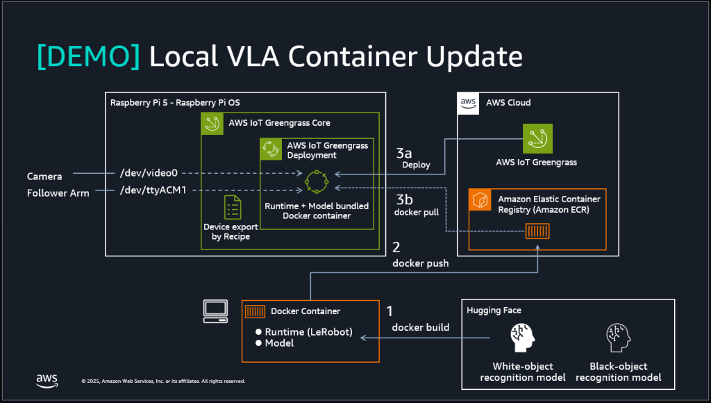 - Deploy: AWS IoT Greengrass pushes that container to a Raspberry Pi in the field, refreshing the robot’s “brain” without anyone ever touching the hardware.
