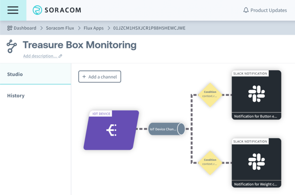 For this setup, we forwarded event notifications received from the IoT devices to Slack using Soracom Flux, a low‑code platform for building applications (shown in the figure below). When a message comes from the button, a Slack message reading “The treasure box was opened!” is sent from the “Action” in the upper right.
