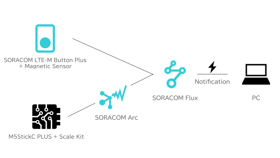 The magnetic sensor is connected to the Soracom LTE‑M Button (which supports 2‑Wire accessories), while the weight sensor is connected to a small IoT device, in this instance it is an M5StickC PLUS.