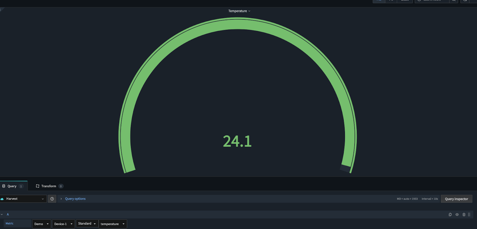 After naming your panel and selecting a Gauge (see above), you will see the following gauge has been created and is displaying the temperature in C.