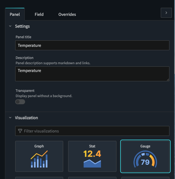 It is also recommended to enter a descriptive name for each panel, which can be specified via the ‘Panel title’ option at the top of the panel Settings screen. I will name this panel Temperature since it contains temperature data.