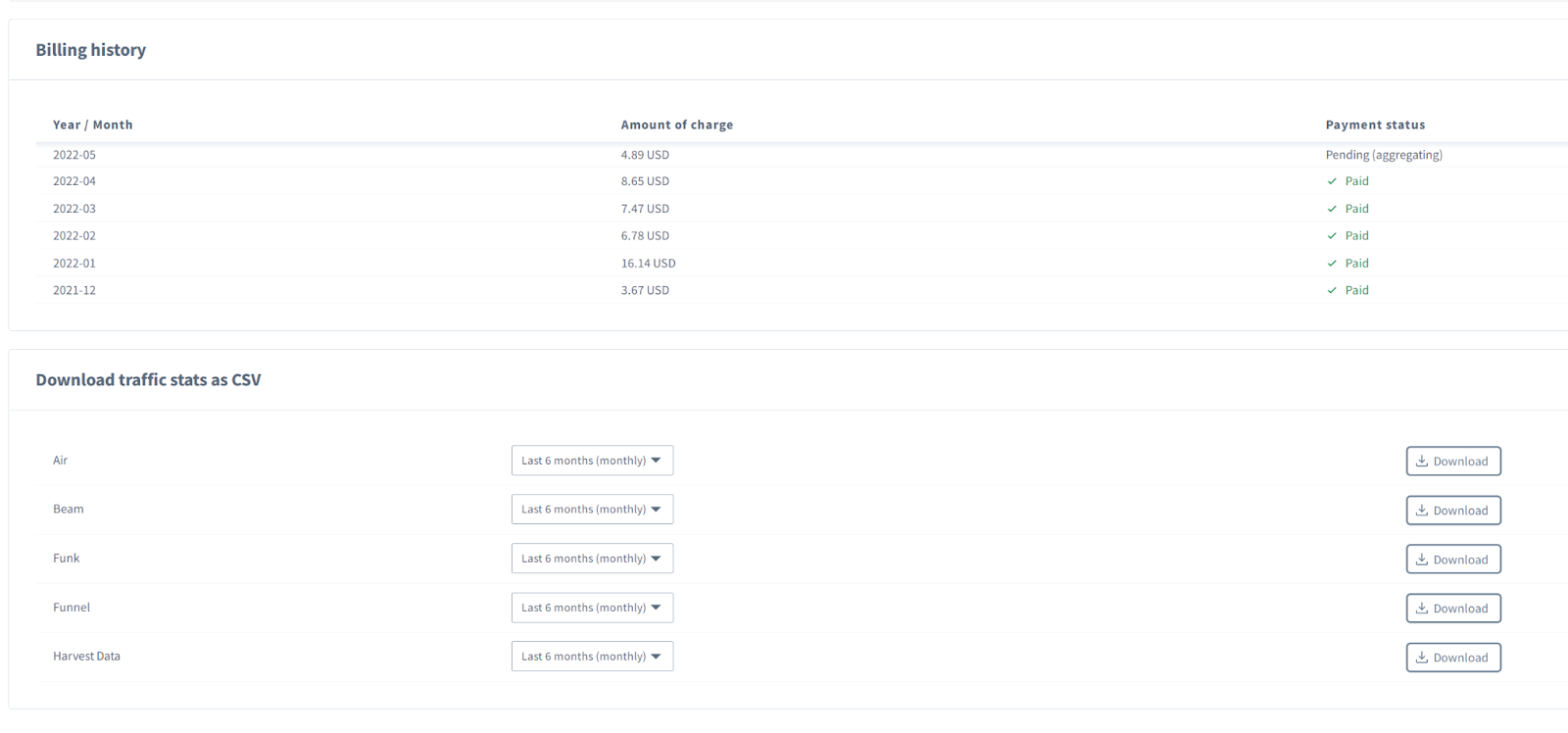 From this screen, you can add or update your payment method. Within the same drop-down menu, if you select Billing, you can see a detailed breakdown of your monthly bills, download an itemized version of each bill in .csv format, and review traffic statistics for a variety of Soracom services.