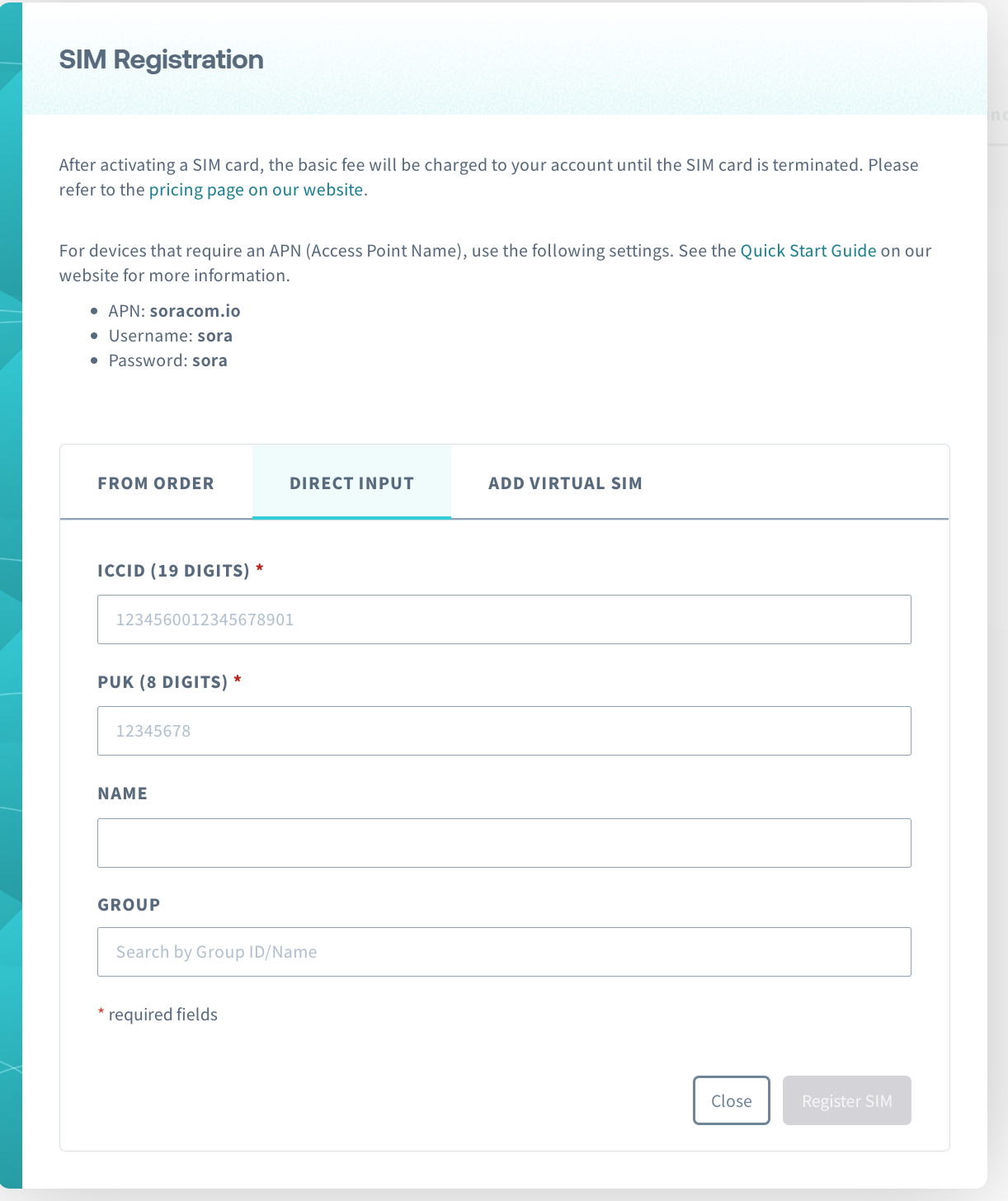 Once you have established a payment method, you are ready to register your SIMs! Doing so is as simple as clicking the Register SIM button and then providing the requested information located on your physical SIM card.