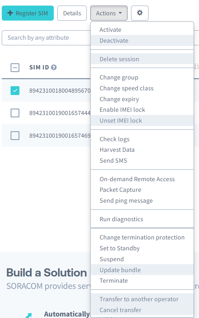 To change a SIM’s status within the user console, simply select the SIM you want to update, select the Actions menu, and choose the desired status.