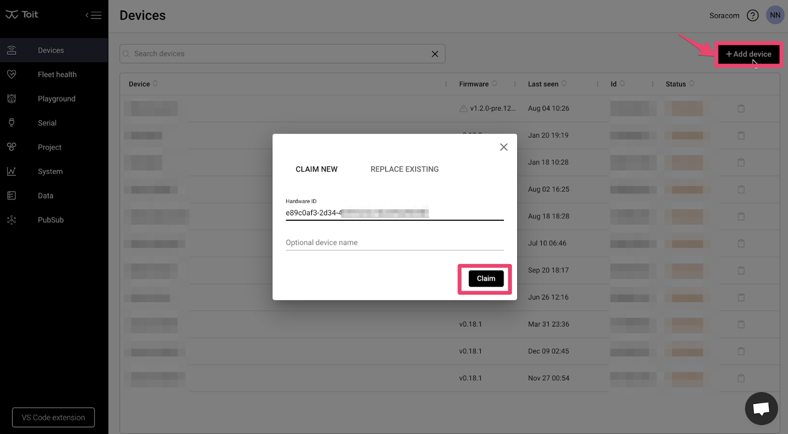 Now that we’re all set, let’s go to the Toit web console and claim my device. I copy and paste the device ID, and hit the claim button.