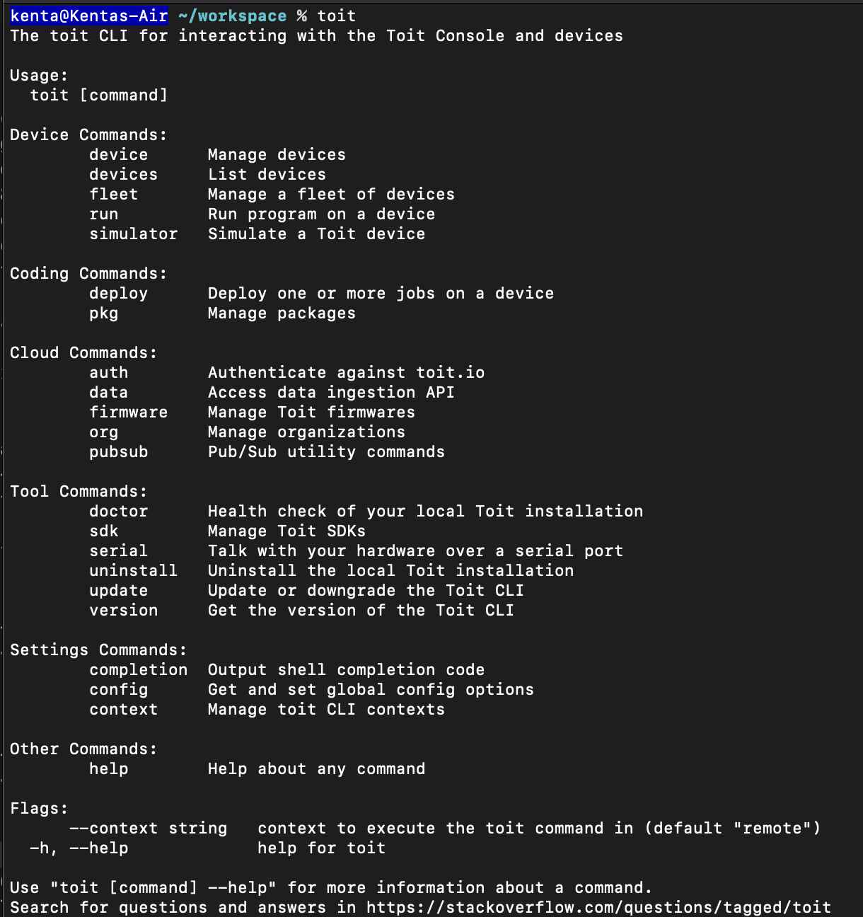 The next step is to flash the board with the Toit firmware. For that, I downloaded Toit CLI from their website and set it up on my Macbook.