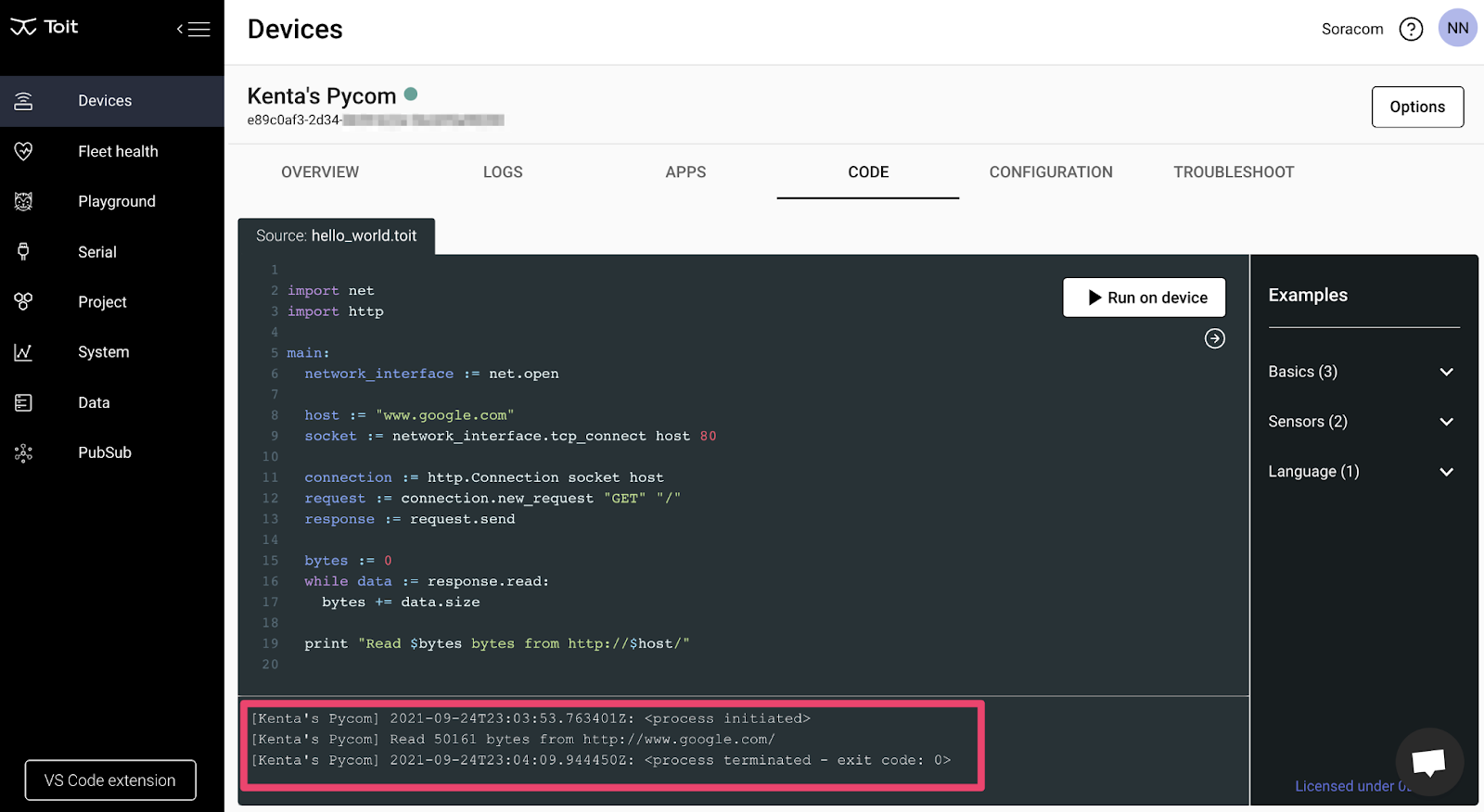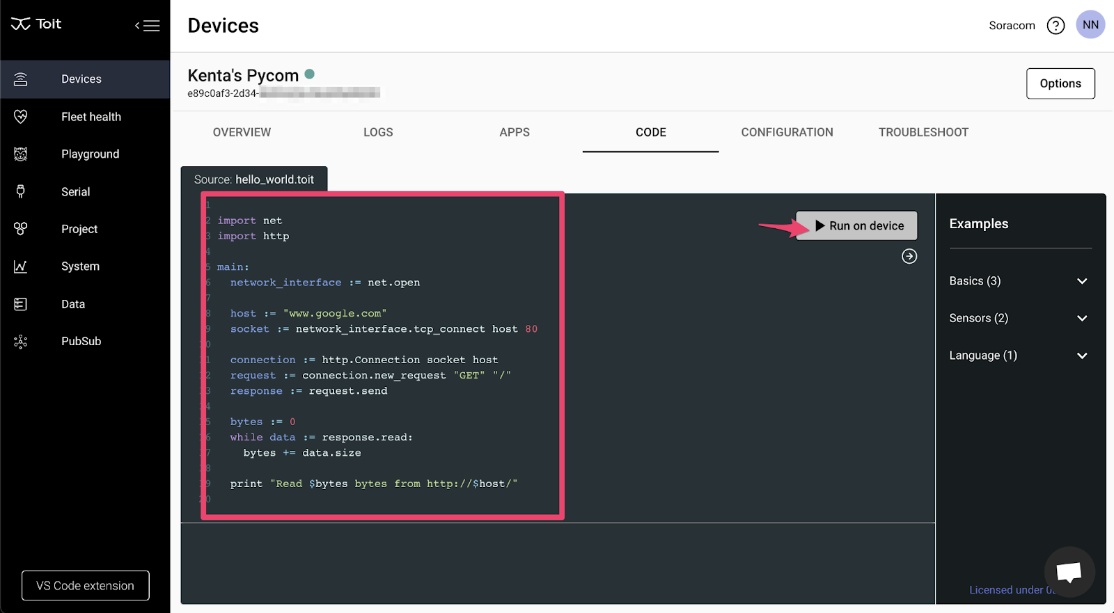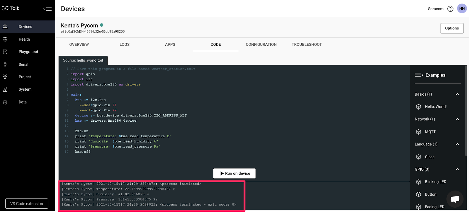 Now let’s go to the “CODE” tab and run a code. I found the following code snippet on the Toit library document.