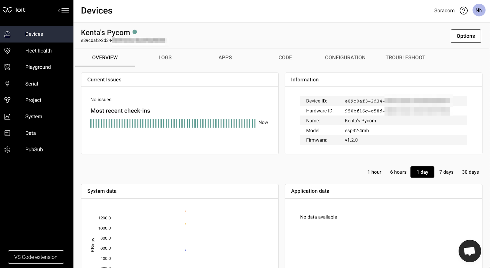 This would be more interesting if we sent it to the cloud, because then we could potentially collect data from many sensors like this and analyze it. Let’s do that! But didn’t I say you’d have to find an SDK suitable for the microcontroller and write code with it? Well, the good news is, we don’t have to in this setup. Why? Because the board has connected with a Soracom SIM, which offers cloud connectivity, not just a simple internet connection.