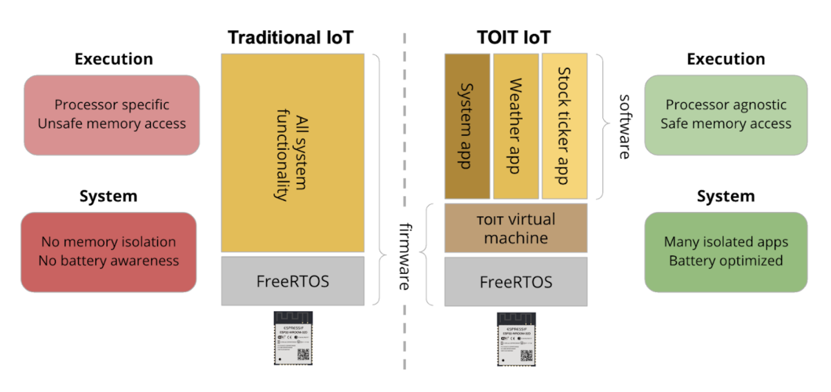 Our partner Toit offers an elegant solution to address the challenges of development for microcontrollers. They have implemented a thin layer on top of FreeRTOS, a popular real-time OS widely used for microcontrollers, that enables the user to run an application as a container. Yes, like a Docker container on Linux!