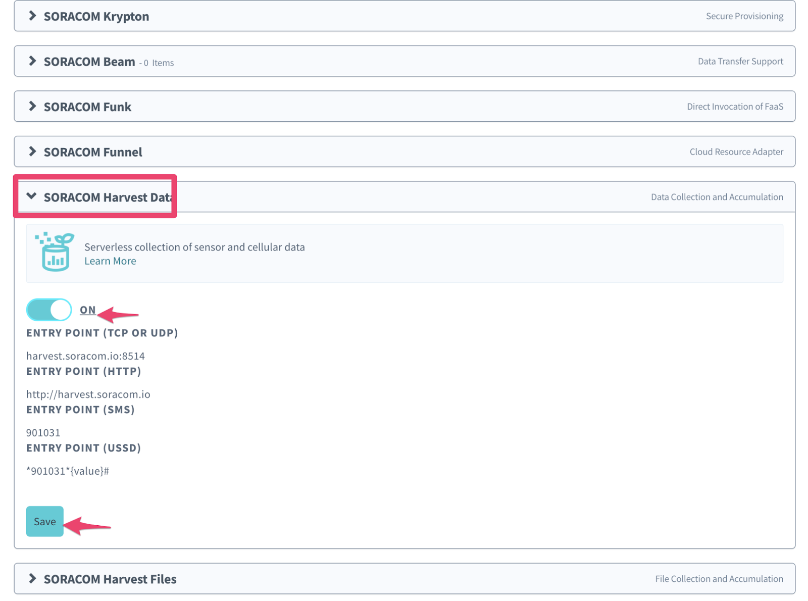 Scroll down to “SORACOM Harvest Data”, open the tab, enable the service and click on “Save”.