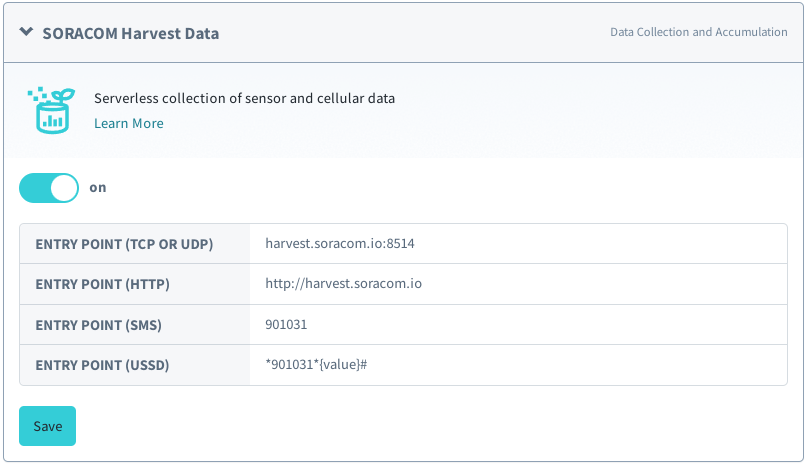 2. Under the SORACOM Harvest Data header, enable Harvest Data, then click Save