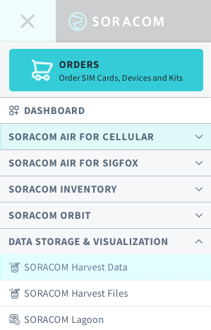To view this data in the Soracom User Console, log in to your account, open the Menu, and select Soracom Harvest Data under the Data Storage & Visualization header.