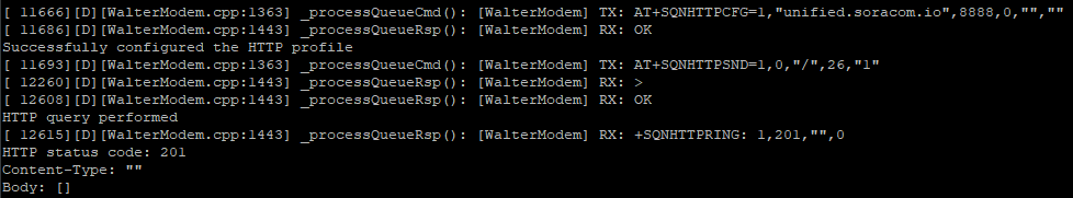 Once the IDE shows that the sketch has been uploaded, the Walter will reset and begin running it. Remember that logging from the sketch can be viewed while it runs, and the 201 HTTP return code can be seen from Harvest Data. The empty body is expected when receiving replies from Harvest Data.