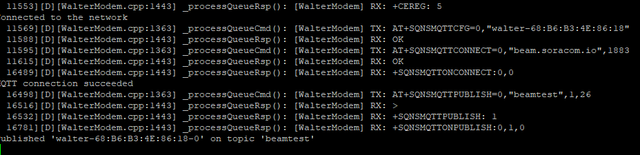 After the IDE shows that the sketch has been uploaded, the Walter will reset and it should begin running. Using the IDE’s built-in serial monitor tool (or another serial terminal application such as PuTTY) set to 921600 baud, we can view the logging from the sketch while it runs. After the APN has been configured, the connection to the network has been established, and the PDP context activated, the Walter will connect to Beam and publish the MQTT data: