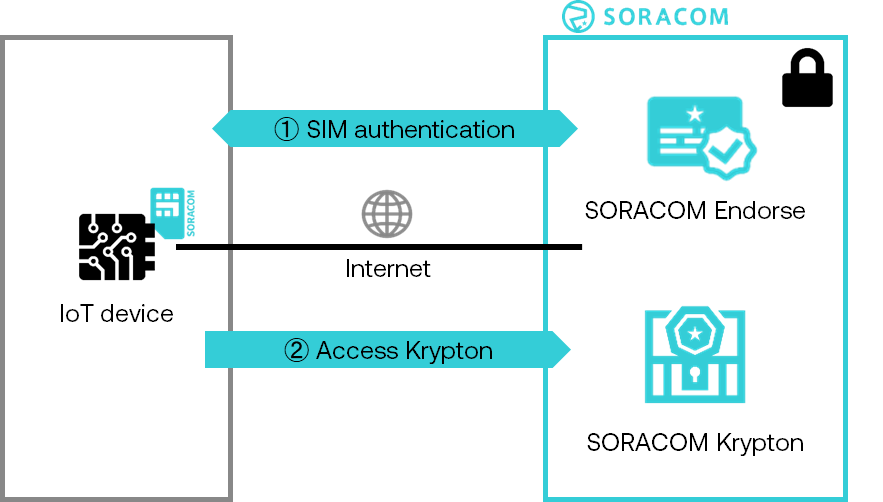 IoT devices access Soracom Krypton endpoints on the Soracom platform to request the distribution of credentials. There are two ways to ensure security for access to Soracom Krypton.