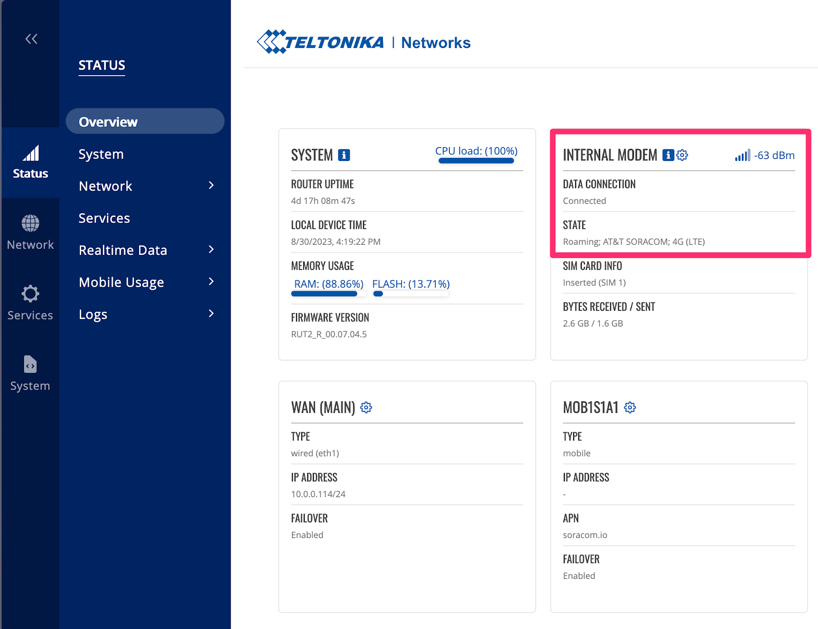 You can confirm that the router is connected through its web-based configuration interface and/or the Soracom user console, as shown below.