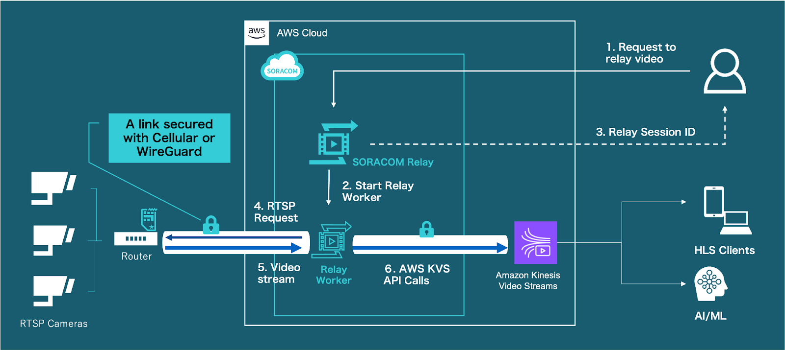 Let’s say RTSP cameras are connected to the Soracom platform using either cellular or WireGuard VPN. That lets Soracom Relay securely access the cameras’ RTSP ports using the secure connection. If the cameras are behind a router that has a secure link to the Soracom platform via cellular or Wireguard, the router can be configured to forward incoming requests to a port to the corresponding port of an RTSP camera.