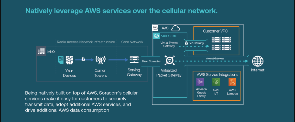 A single Soracom IoT SIM (or eSIM) gives users access to a global, multicarrier IoT cellular network while routing and managing their data privately through Soracom’s virtualized packet gateway in the cloud. Soracom users can create secure, direct pipelines between IoT devices and their preferred AWS services, turn off all external access to the public internet (by enabling VPC peering directly from Soracom to their AWS VPC), and even automate data ingestion to speed up data integration.