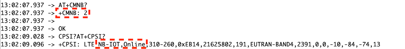 Since the Soracom console shows “Radio type” as LTE, we want to make sure that it is connected to the NB-IoT network. The part of the log that shows network status is below.